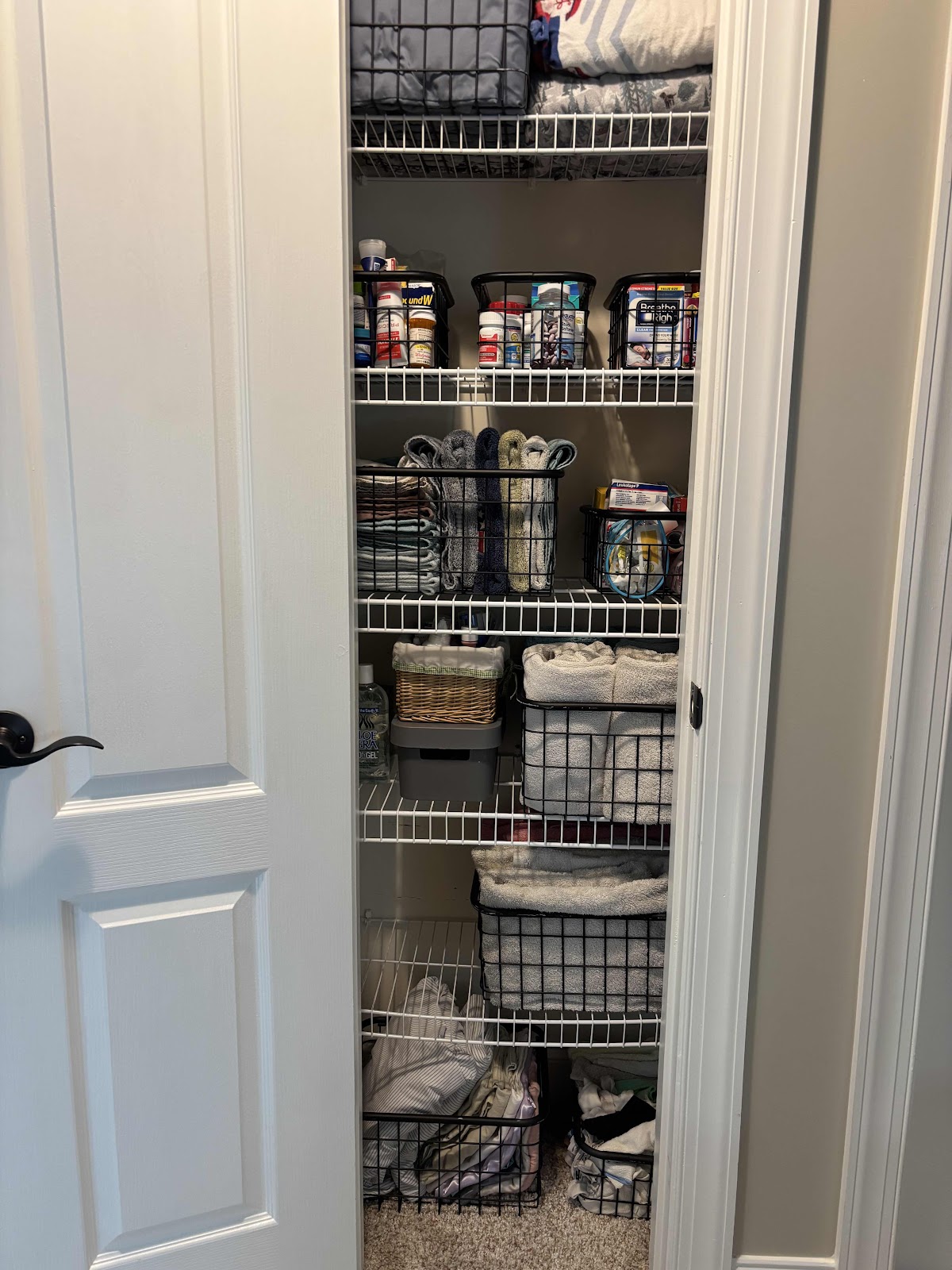I removed a garbage bag full of rags, 3 sets of sheets, and extra/old medicines. Why was all of that stuffed inside? It looks so much better and makes so much more sense. And also #ihatewireshelves